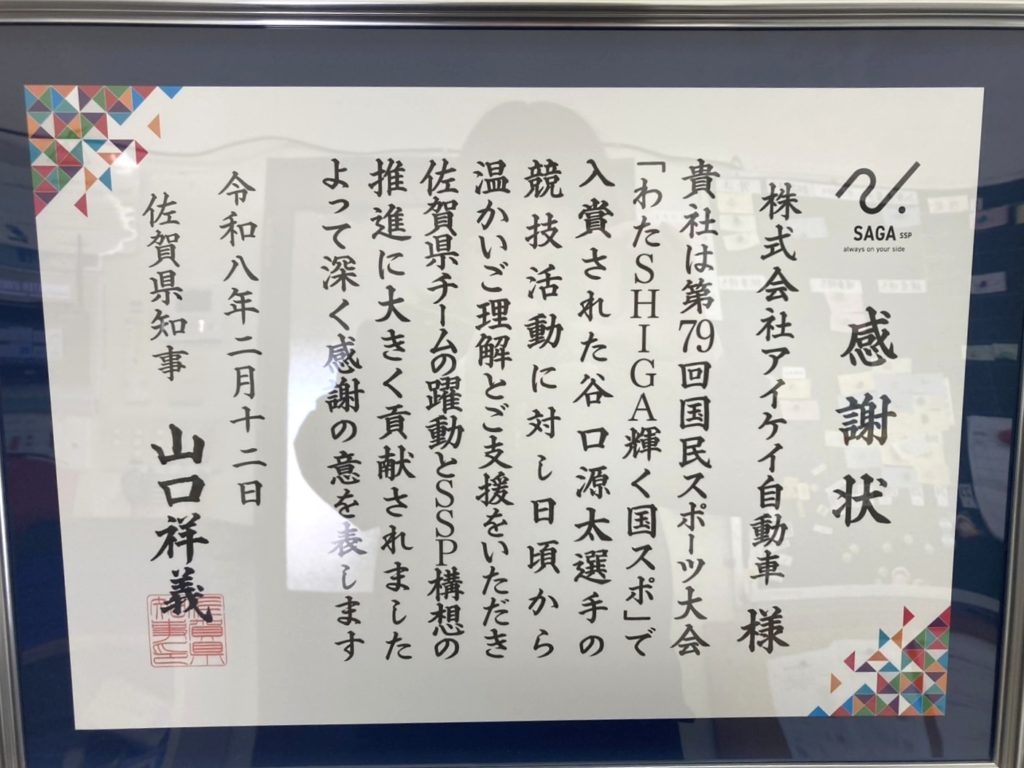 このたび、グループ会社のアイケイ自動車が、第79回国民スポーツ大会「わたSHIGA輝く国スポ」において、ウエイトリフティング成年男子55kg級スナッチ部門で金メダルを獲得された谷口源太選手の競技活動を、日頃からサポートしてきたことに対し、佐賀県より感謝状をいただきました。