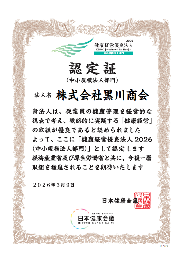 令和8年3月、『健康経営優良法人2026(中小規模法人部門)』に、本年も引き続き認定をいただきました。